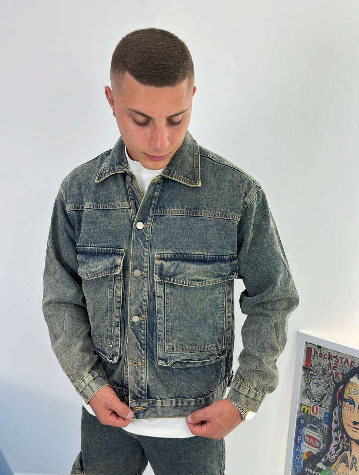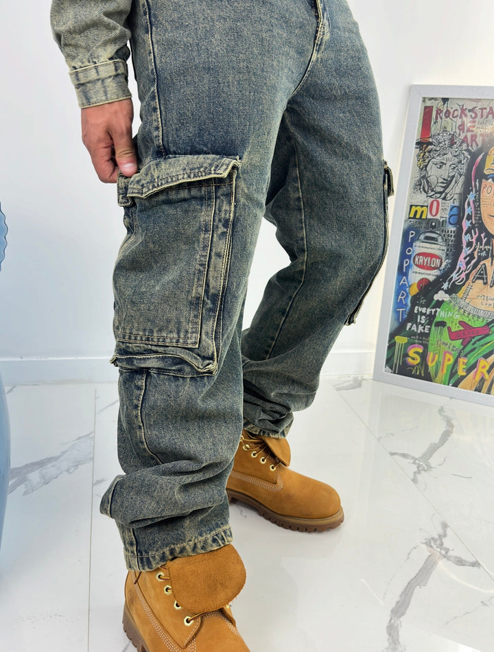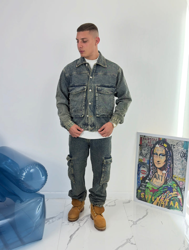 Questo coordinato in jeans è perfetto per un look casual ma elegante. Il pantalone baggy offre comodità e la giacca con tasconi permette di avere tutto a portata di mano. Il lavaggio chiaro sabbiato conferisce un tocco di stile sofisticato. Ideale per chi vuole un outfit versatile e moderno.