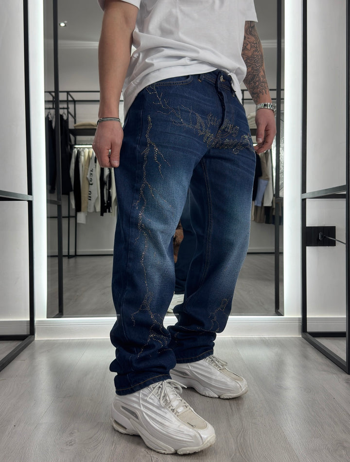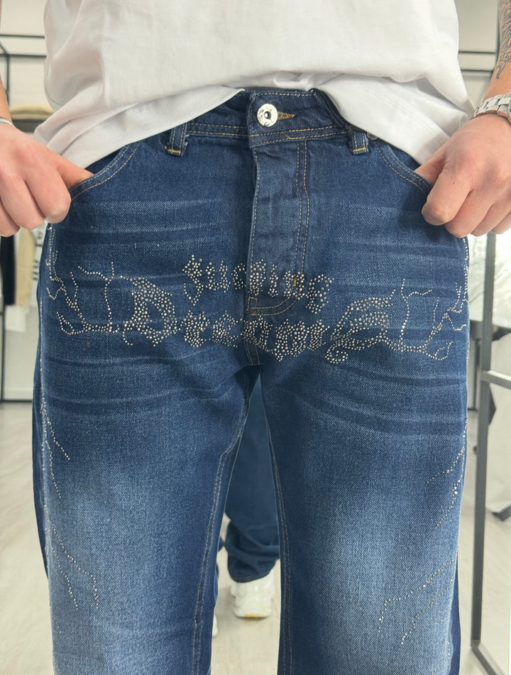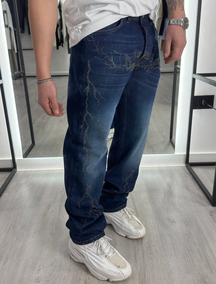 "I nostri Jeans Diamond Blue in taglio regolare sono l'ultima tendenza con un tocco di brillantezza e stile. I brillantini e i fulmini aggiungono un tocco di glamour al classico jeans blu. Questo pantalone è perfetto per chi cerca un look elegante e alla moda."