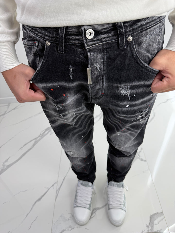 I Jeans Made in Italy Monaco offrono un taglio slim fit che si adatta perfettamente al tuo corpo, garantendo un aspetto elegante e moderno. Il lavaggio grigio scuro con sfumature bianche e schizzi dona un tocco unico e di tendenza a questo capo di jeans. Realizzati con cura e precisione in Italia, questi jeans incarneranno lo stile e l'artigianato italiani di alta qualità.