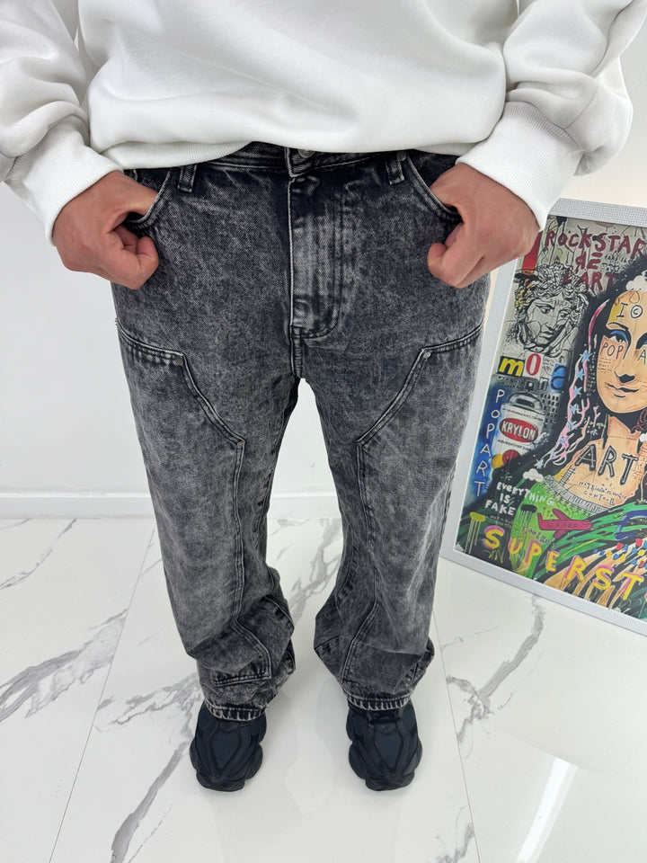 Questi jeans regular fit con dettagli da carpentiere sono perfetti per un look casual ma sofisticato. Il marmorizzato grigio e nero aggiunge un tocco di originalità, mentre il taglio comodo e resistente garantisce comfort e durata. Ideali per un look urbano e moderno.