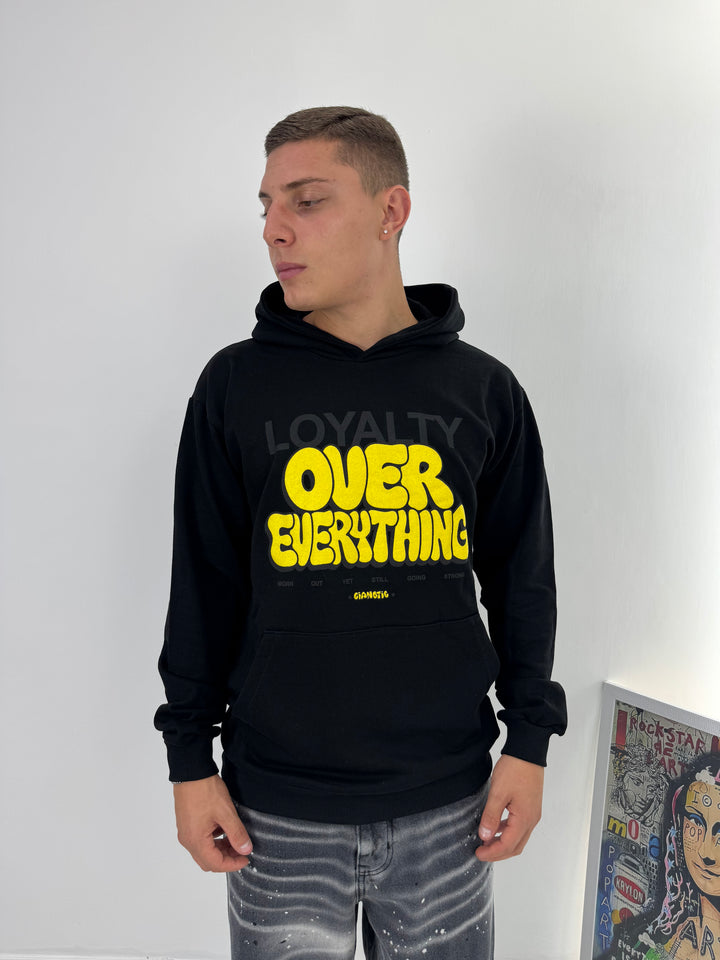 Questa felpa regular fit di alta qualità è perfetta per i mezzi tempi grazie al suo design elegante e alla produzione Made in Italy. La stampa gommata sul fronte, nera e gialla, aggiunge un tocco di stile unico. Dotata di cappuccio, è ideale per affrontare qualsiasi condizione climatica.