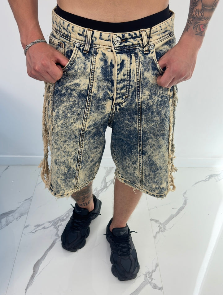 Questo pantaloncino di jeans baggy è realizzato in Italia e presenta un accattivante mix di colori beige e blu con dettagli sfrangiati. Comodo e di tendenza, perfetto per un look casual ma sempre alla moda. Prodotto di qualità made in Italy.